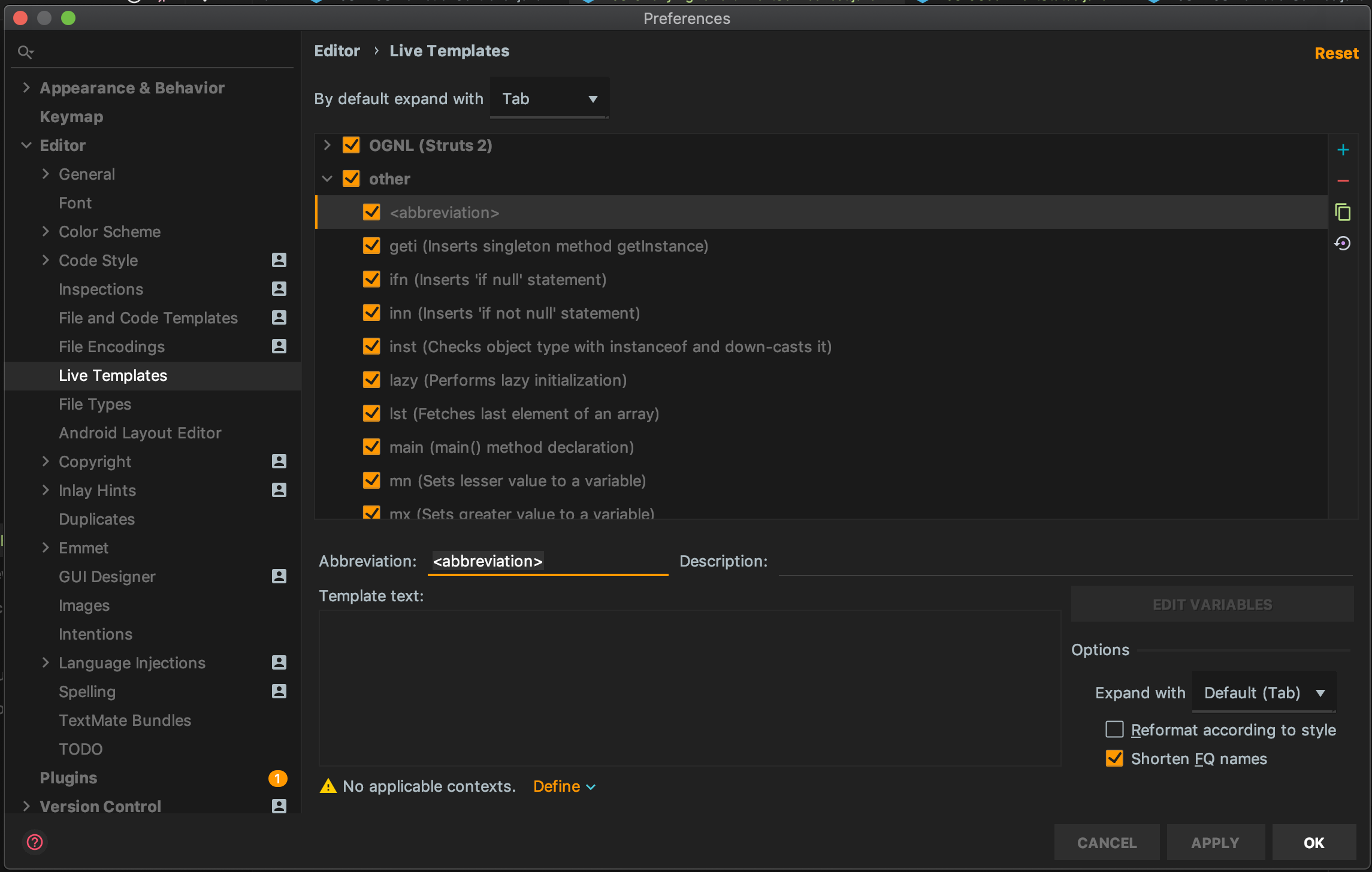 이번 포스트에서는 IntelliJ에서 유용하게 사용할 수 있는 커스텀 Live Template을 추가하는 방법을 소개합니다. Live Template 기능 소개 Live Template 은 간단한 약어로 예약된 코드를 Generate 해주는 유용한 기능인데요. 예를들어 코드 편집창에서 main이라 치면 public static void main(String[] args) { } 이렇게 메인 메소드가 Generate됩니다. IntelliJ의 Preferences > Editor > Live Templates 에서 제공되는 Live Template들을 확인할 수 있습니다. 커스텀 Live Template 추가 Preferences > Editor > Live Templates 메뉴 우측에 + 버튼을 클릭하여..